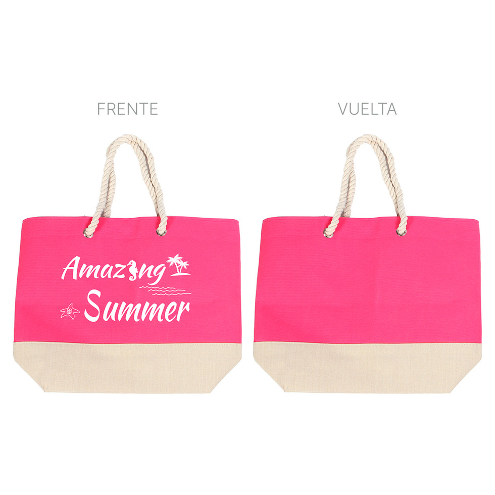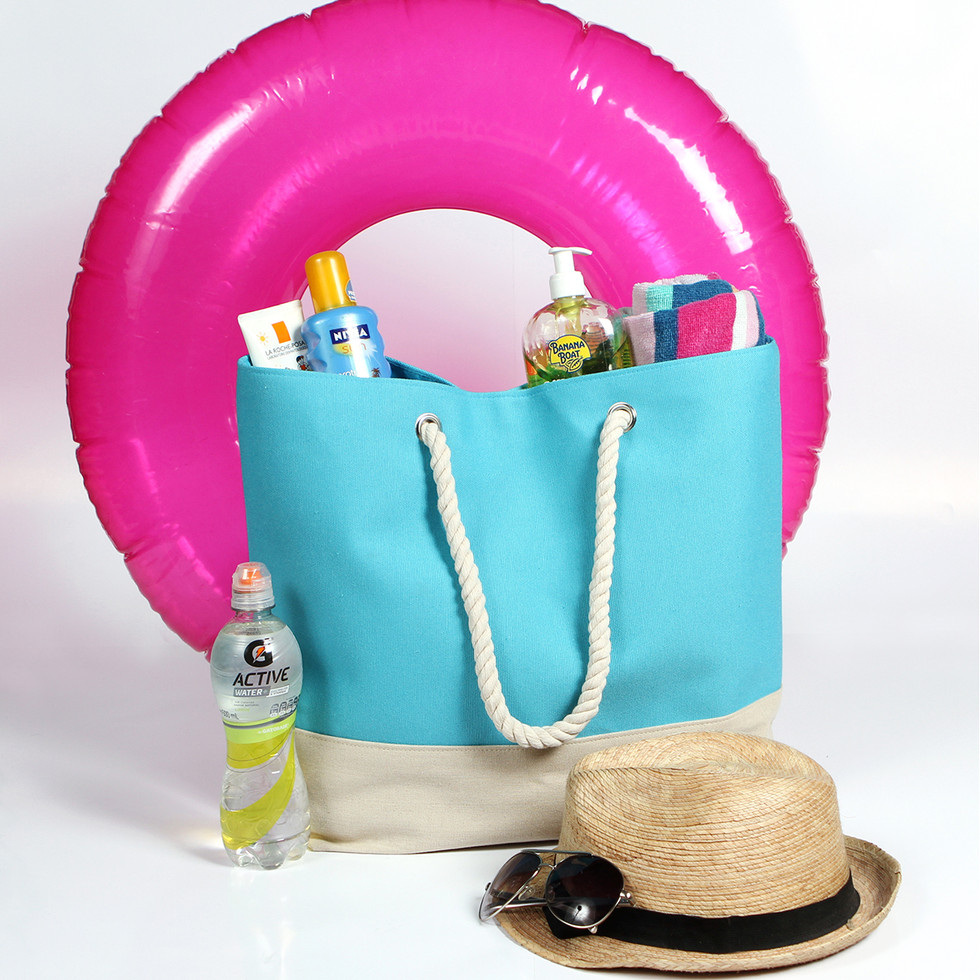 Bolsa de playa bi-tono fabricada en poliéster con correas tipo cuerda y ojillos metálicos. Gran capacidad y espacio para llevar todo lo que necesites.