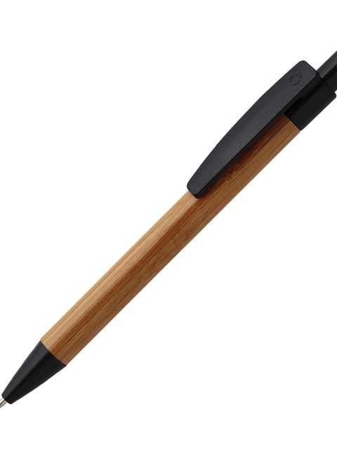 Bolígrafo retráctil fabricado en bambú con punta y clip de plástico en color, tinta de escritura negra.
