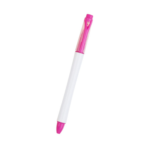 Bolígrafo 2 en 1 con marca textos; barril plástico color blanco, tapa en la parte superior translucida con detalles de color en clip y punta. Tinta de escritura negra.