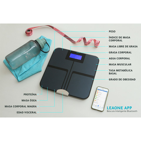 Báscula de cristal templado con base de plástico, APP para vincular a dispositivo móvil, ocupa 4 baterías AAA, (no incluidas) se puede monitorear: peso, índice de masa corporal, grasa corporal, agua corporal, masa muscular, grado de obesidad, proteína, masa ósea, edad visceral, entre otras. Capacidad de 3 a 180 kg.