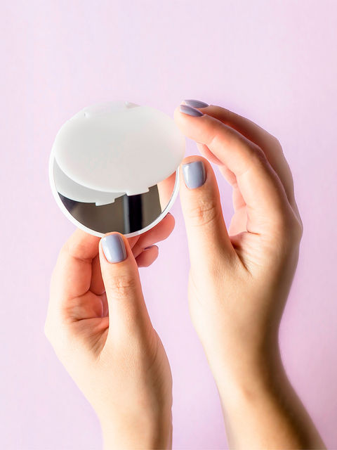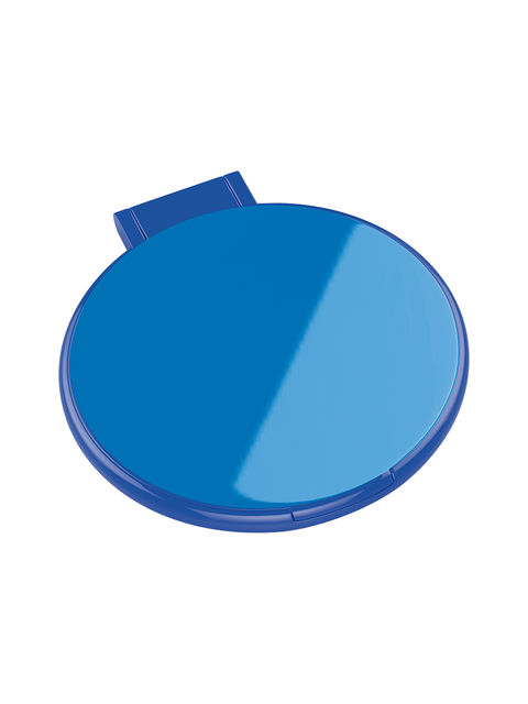 Espejo redondo de plástico translucido, ideal para bolsillo.