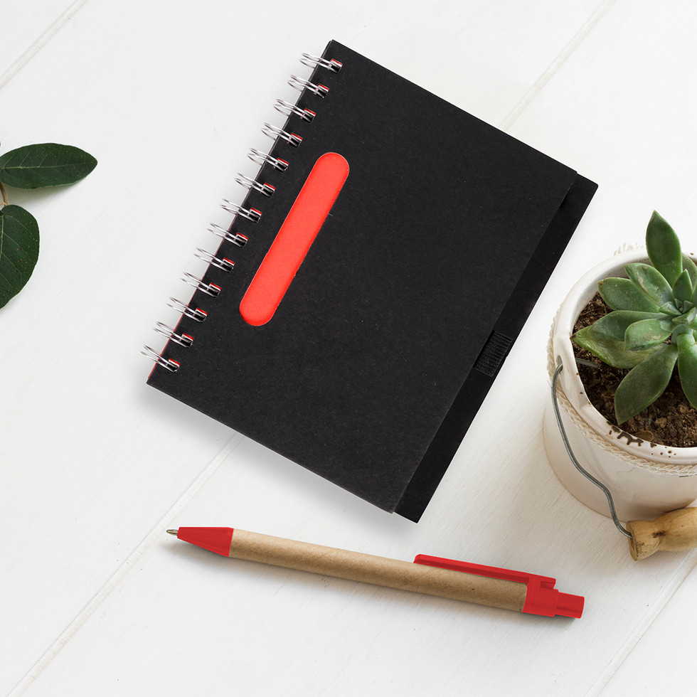 Libreta ecológica negra con 80 hojas de raya, pluma tinta negra y detalles en color en el interior. Además, en el interior de la libreta encontrará detalles en color que le dan un toque de estilo y personalidad. Es una elección consciente para aquellos preocupados por el medio ambiente.