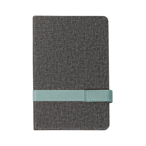 Libreta fabricada en tela, con broche de color en curpiel . Cuenta con separador de hojas el cual va a juego con el broche para cerrar , 80 hojas de raya. Tamaño A5.