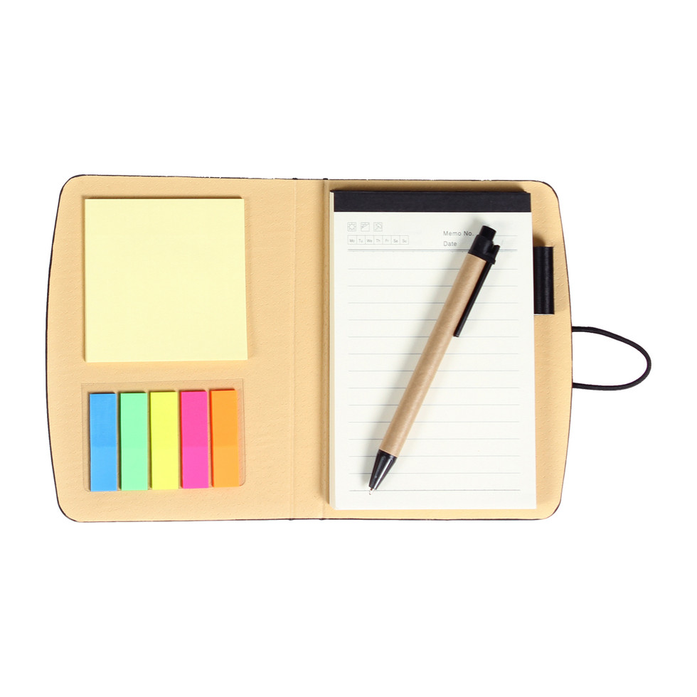Libreta de curpiel con 70 hojas de rayas, pluma ecológica tinta negra, broche metálico con resorte de seguridad, set de notas e identificadores.