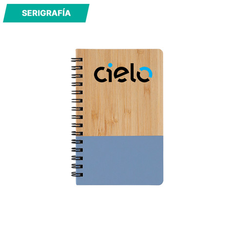 Libreta con pasta de bambú y detalle de color en plástico PU, espiral metálica y 60 hojas rayadas de 70 g. Tamaño A6.