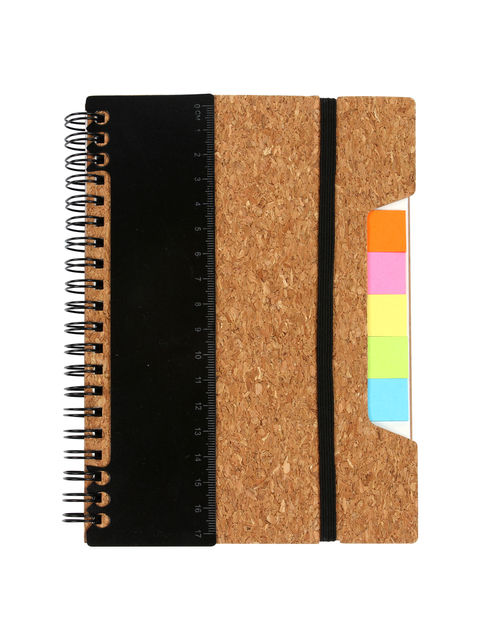 Libreta con pasta tipo corcho, regla, resorte sujetador de pastas y banderas autoadheribles, con 80 hojas de raya.