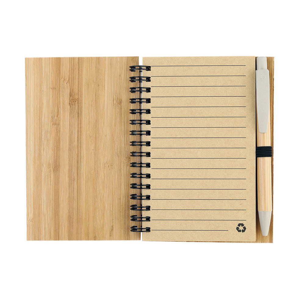 Libreta con pasta rígida de bambú, 70 hojas de papel kraft, con banda elástica y bolígrafo con barril de bambú y detalles en fibra de bambú. Tinta de escritura negra. Tamaño A6.