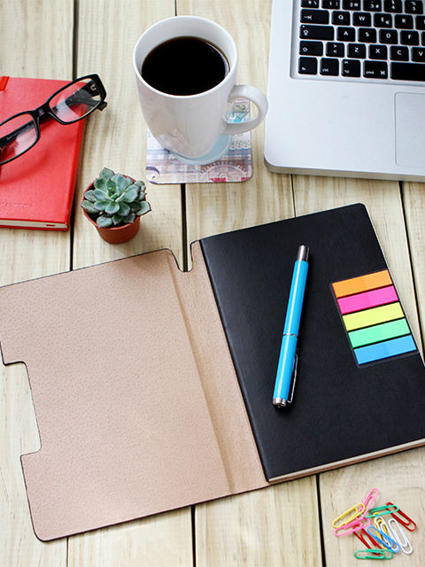 Libreta fabricada en poliuretano con 80 hojas rayadas y banderines adheribles. Tamaño A5..