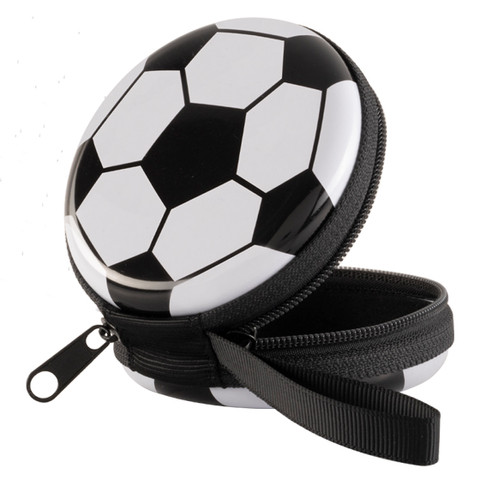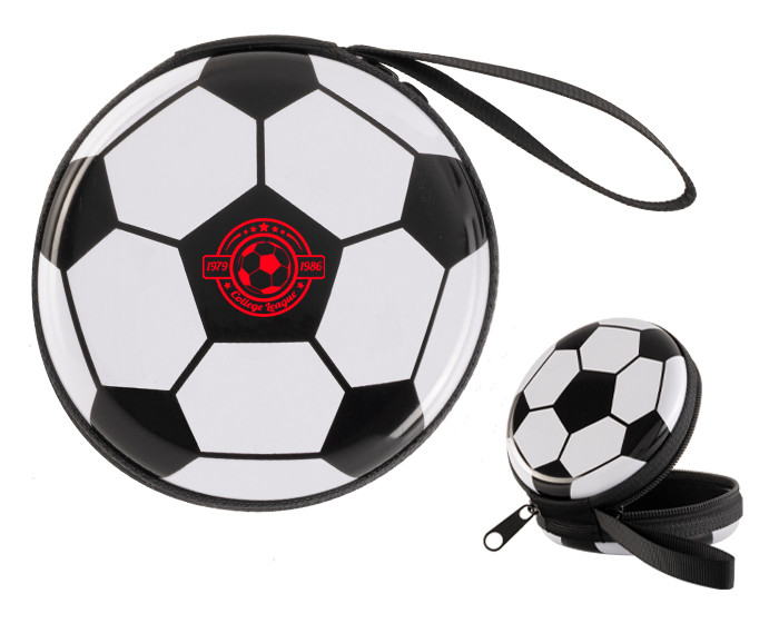 Estuche monedero en forma de balón de soccer, cuenta con cierre lateral doble y jareta.
