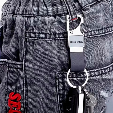 Llavero metálico multifuncional con correa de PU, gancho para colgarse y destapador. Presentación: caja individual.