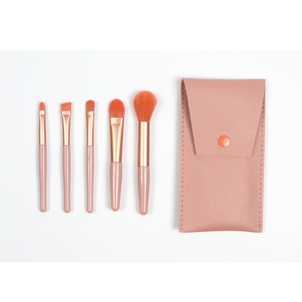 El set de brochas con 5 piezas incluye brochas fabricadas en plástico PS, un material ligero pero resistente, el aluminio se utiliza en la construcción de las férulas de las brochas, proporcionando estabilidad, las cerdas de las brochas están hechas de nylon suave y sintético. Estas cerdas son ideales para aplicar y difuminar productos de maquillaje de manera uniforme. Viene acompañado de un estuche de curpiel, un material sintético que imita la apariencia y textura del cuero.
