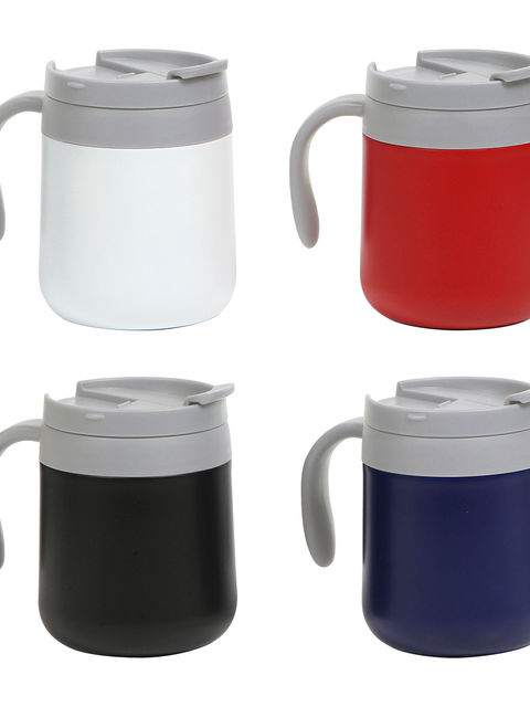 Taza térmica de en acero inoxidable doble pared, con asa y tapa de polipropileno (PP). Fabricado en materiales de grado alimenticio, mantiene bebidas frías o calientes por un largo tiempo, no usar en microondas, capacidad 390 ml. Incluye caja de cartón individual.