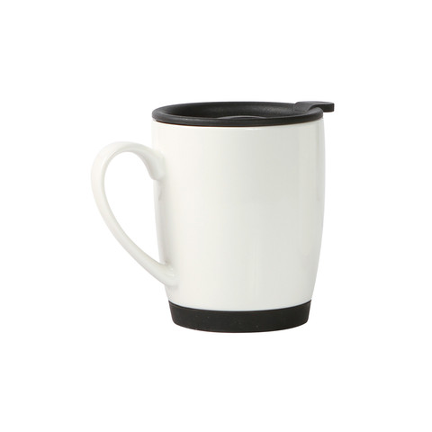 Taza de cerámica blanca con tapa y base tipo Ruber en color, capacidad de 300 ml.