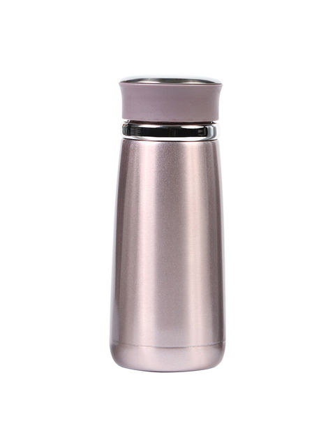 Termo de acero inoxidable doble pared con acabado brillante y detalles metálicos, fabricado en materiales de grado alimenticio, mantiene bebidas frías o calientes por un largo tiempo, no usar en microondas. Capacidad de 420 ml (14 oz). Incluye caja de cartón individual.