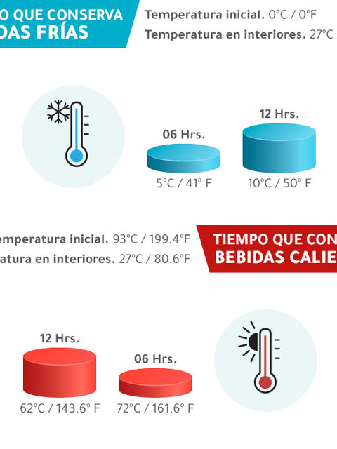 Termo de acero inoxidable doble pared con asa de plástico y detalles metálicos, fabricado en materiales de grado alimenticio, mantiene bebidas frías o calientes por un largo tiempo, no usar en microondas. Capacidad de 510 ml (17 oz). Incluye caja de cartón individual.