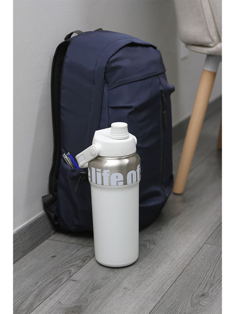 Termo doble pared fabricado en acero inoxidable, con popote interno, detalle plateado y agarradera. Capacidad de 1000 ml.