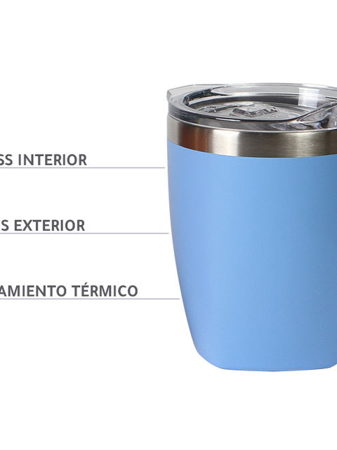 Vaso de acero inoxidable doble pared, con tapa de plástico deslizable transparente, fabricado en materiales de grado alimenticio, mantiene bebidas frías o calientes por un largo tiempo, no usar en microondas, capacidad de 260 ml ( 9 oz ). Incluye caja de cartón individual.